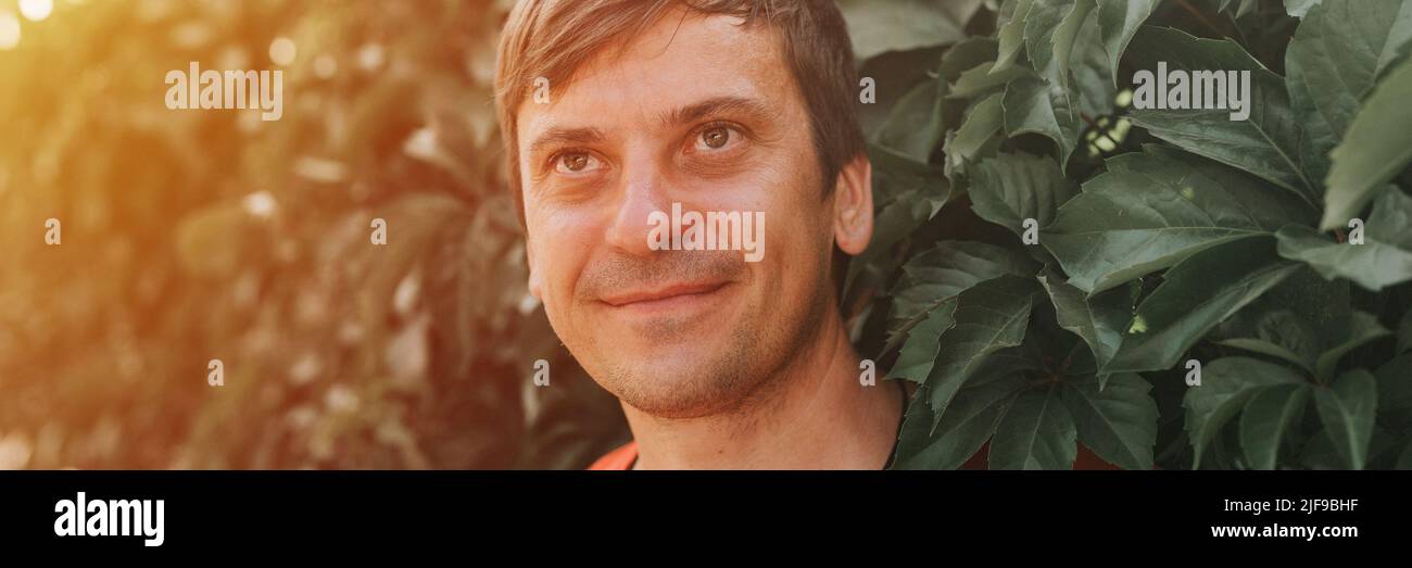 Portrait Of Face Happy Smiling Unshaven Mature 40 Years Man Solo Traveler With Stubble On The Background Of Green Trees Plants In Nature On Sunny Sum Stock Photo Alamy